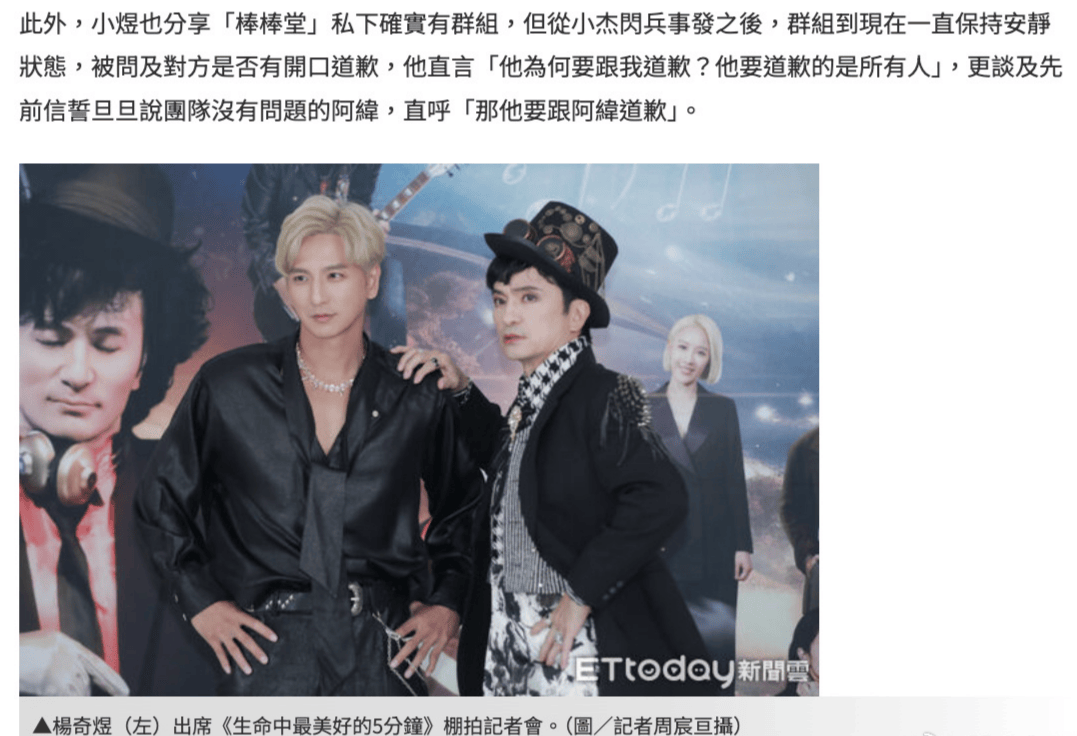 此外,小煜還透露,受此次事件影響,棒棒堂原本為合體綜藝展開的籌備已全面暫停,“節(jié)目只錄了一點(diǎn)點(diǎn)就馬上停止,大家也回歸各自工作,目前沒有后續(xù)計(jì)劃”。對(duì)于團(tuán)隊(duì)私下群組的狀態(tài),他表示自小杰事發(fā)后群組便 “一直保持安靜”,被問及是否收到小杰道歉時(shí),更直言 “他為何要跟我道歉?他要道歉的是所有人”,還提及此前曾信誓旦旦稱團(tuán)隊(duì)無問題的成員阿緯,稱 “那他要跟阿緯道歉”,言語間難掩對(duì)事件的無奈。
